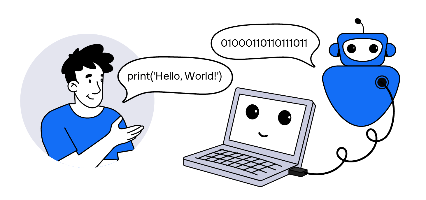 Kompyuterning “miyasi” hisoblangan protsessor ham dasturchi dasturlash tilida yozgan kodni tushunmaydi. Protsessor faqatgina nol va birlardan iborat ketma-ketlikni qabul qiladi. Dasturchi va kompyuter bir-birini tushunishiga ham maxsus tarjimonlar: kompilyator va interpretatorlar yordam beradi.